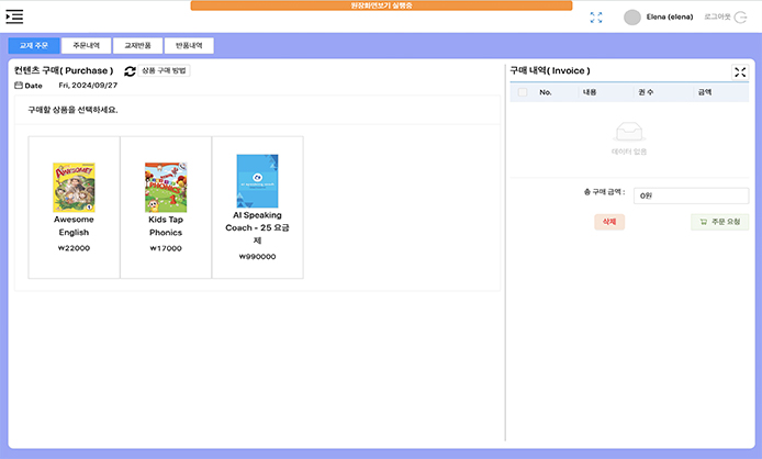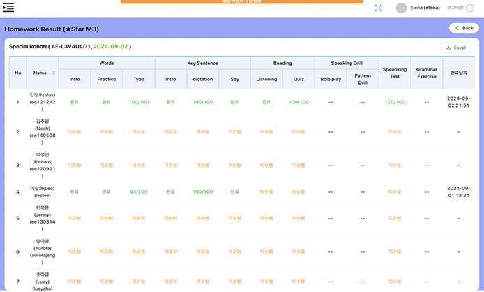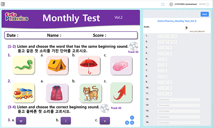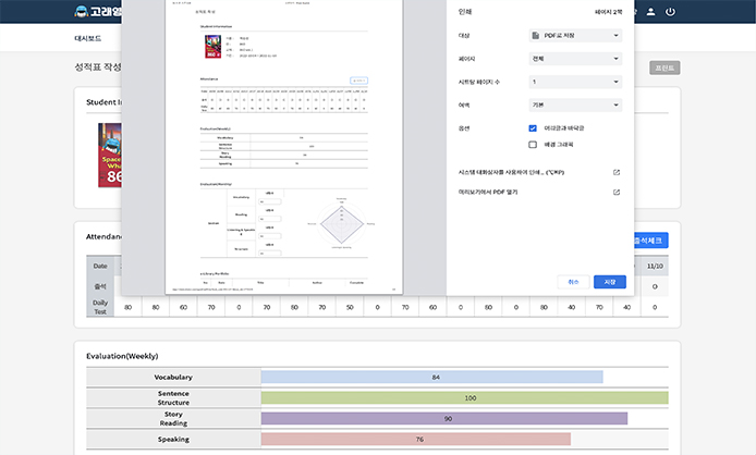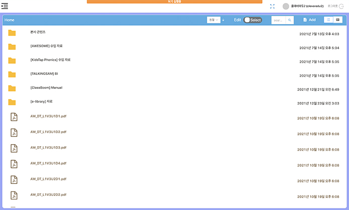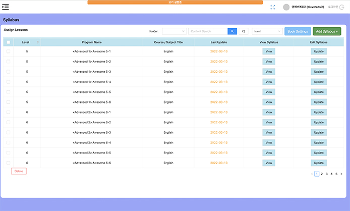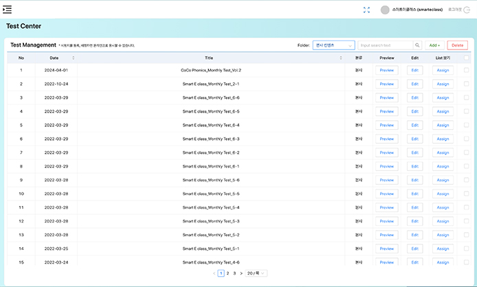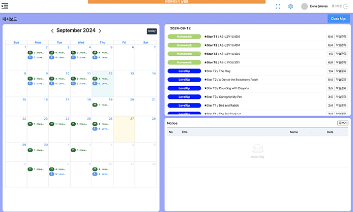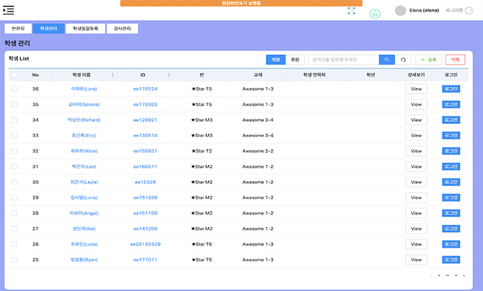 Cloubot LMS Platform 은 회원 및 숙제 관리, 수업 운영 페이지, 테스트 센터 등 다양한 관리 페이지를 제공 하고 있습니다.