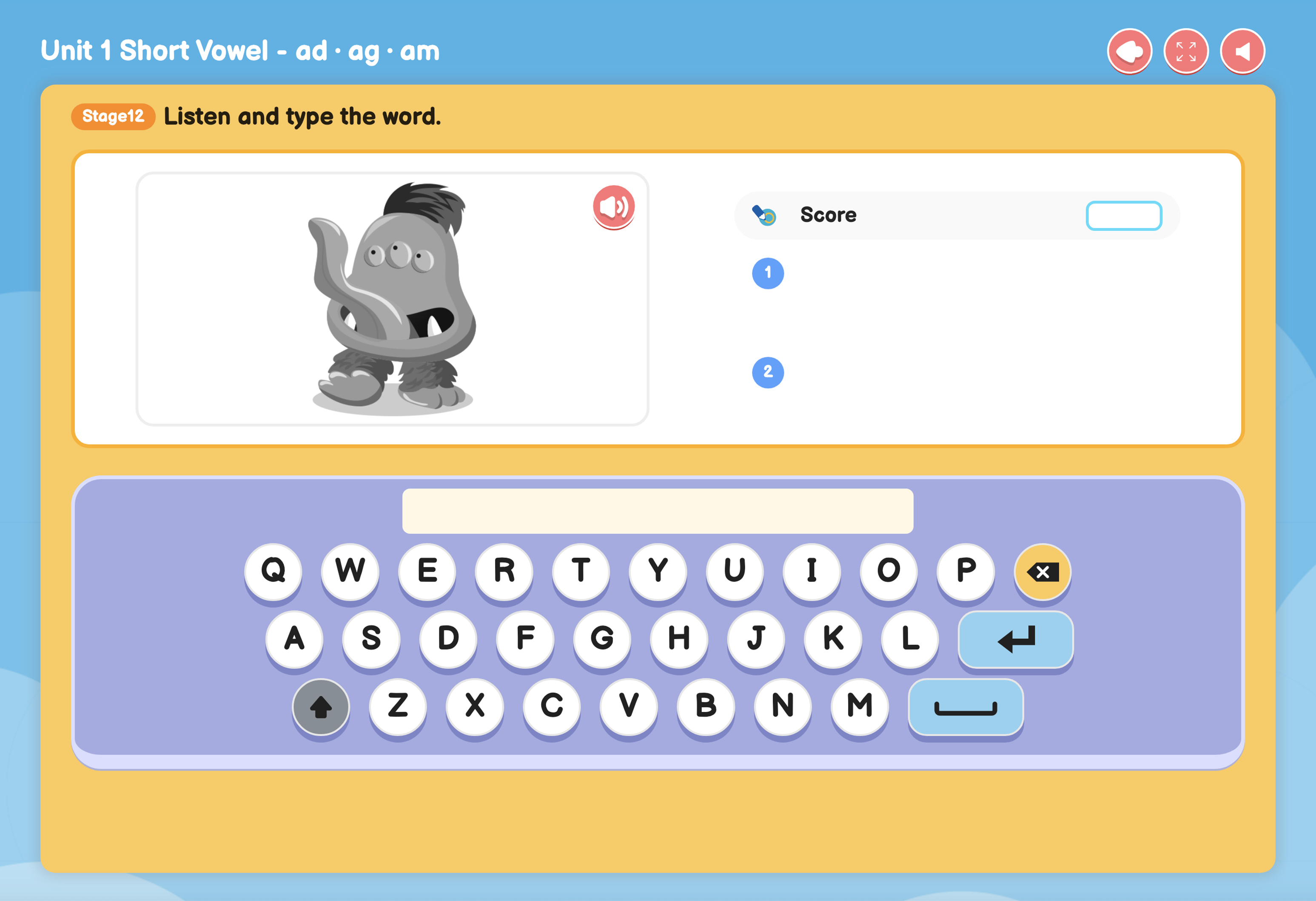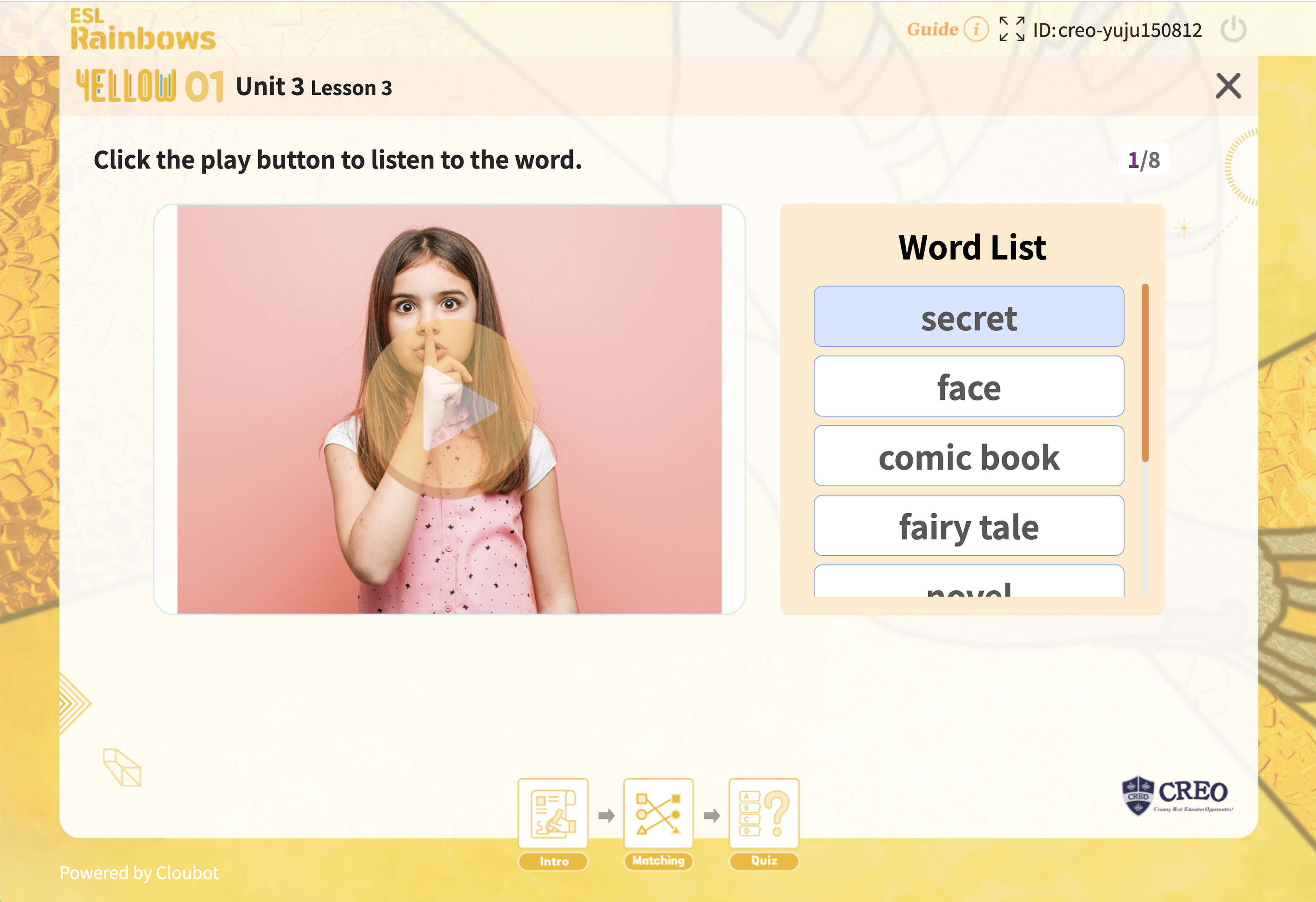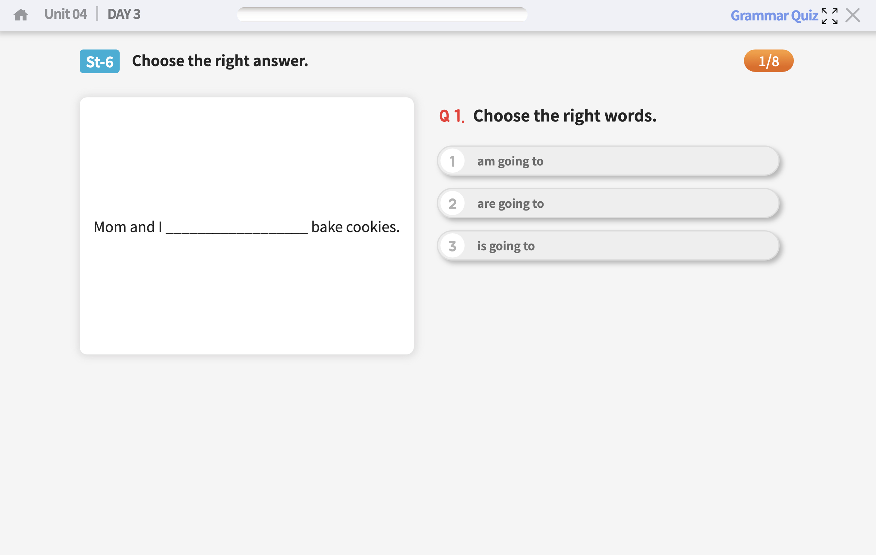 어휘에 대한 온라인 학습 단계이며 이미지와 단어를 매칭 하며 학습 한 후 Word Practice 와 Typing 훈련을 통해 어휘를 익힐 수 있습니다. 레벨에 따라 Word Game과 Quiz 등을 추가 할 수 있습니다.