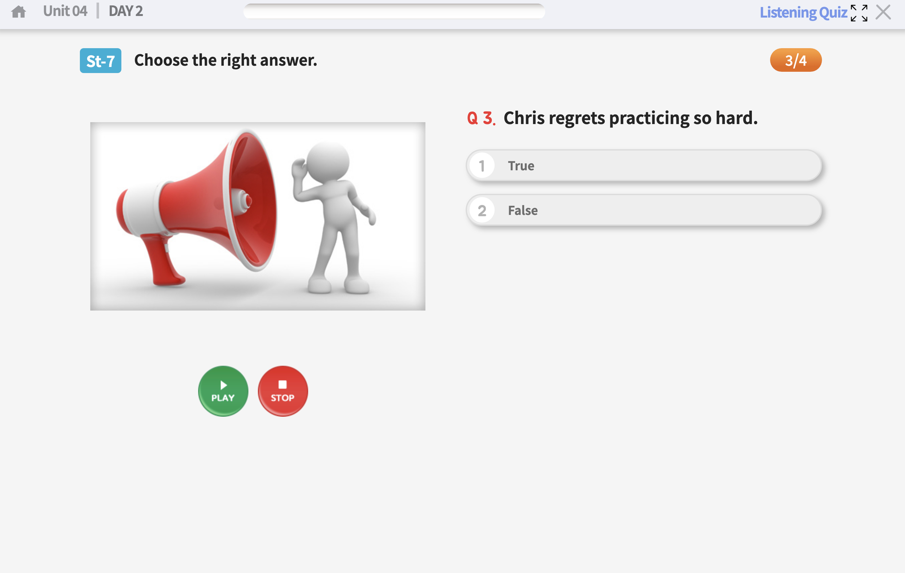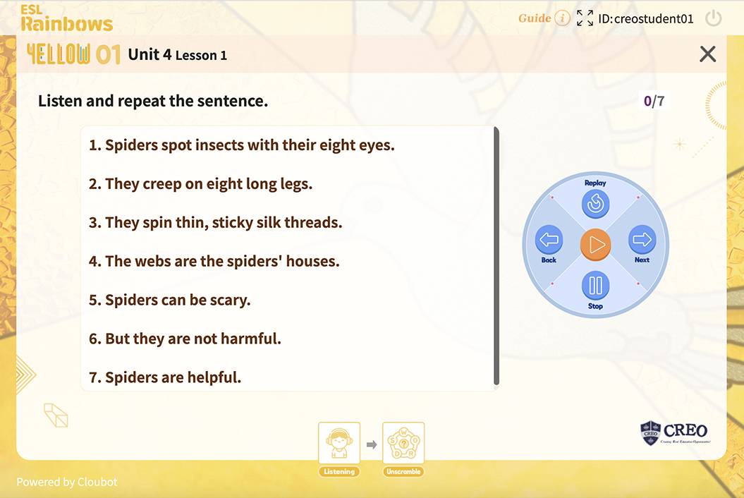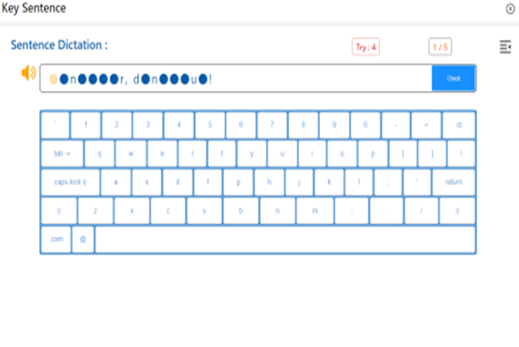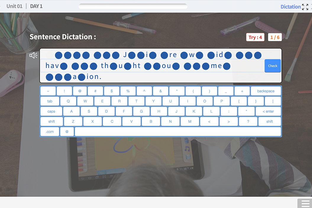 문장 학습 단계로 Listen & Repeat, Unscramble, Dictation 등 다양한 학습 툴에서 문장 학습을 듣고, 말하고 녹음 할 수 있습니다.